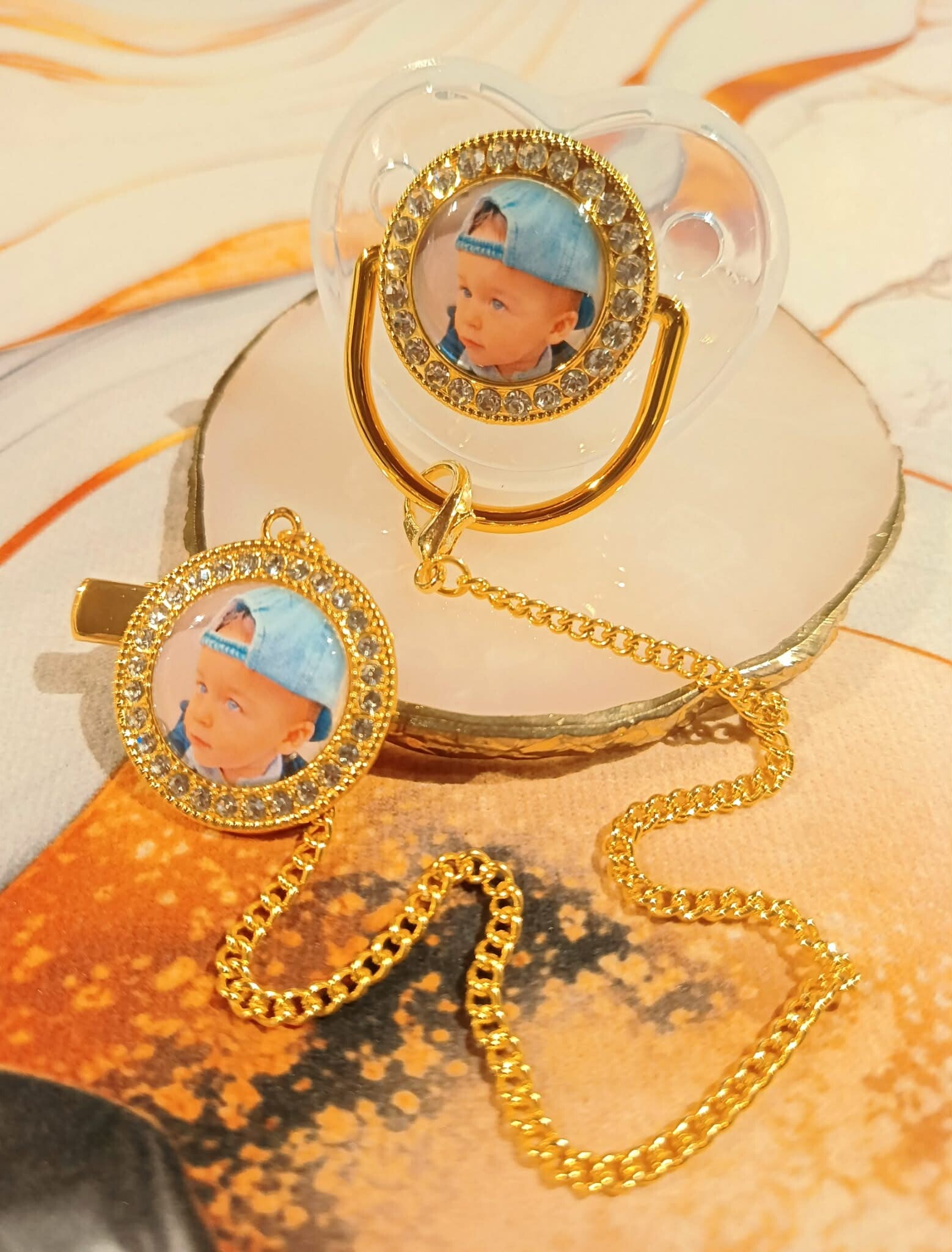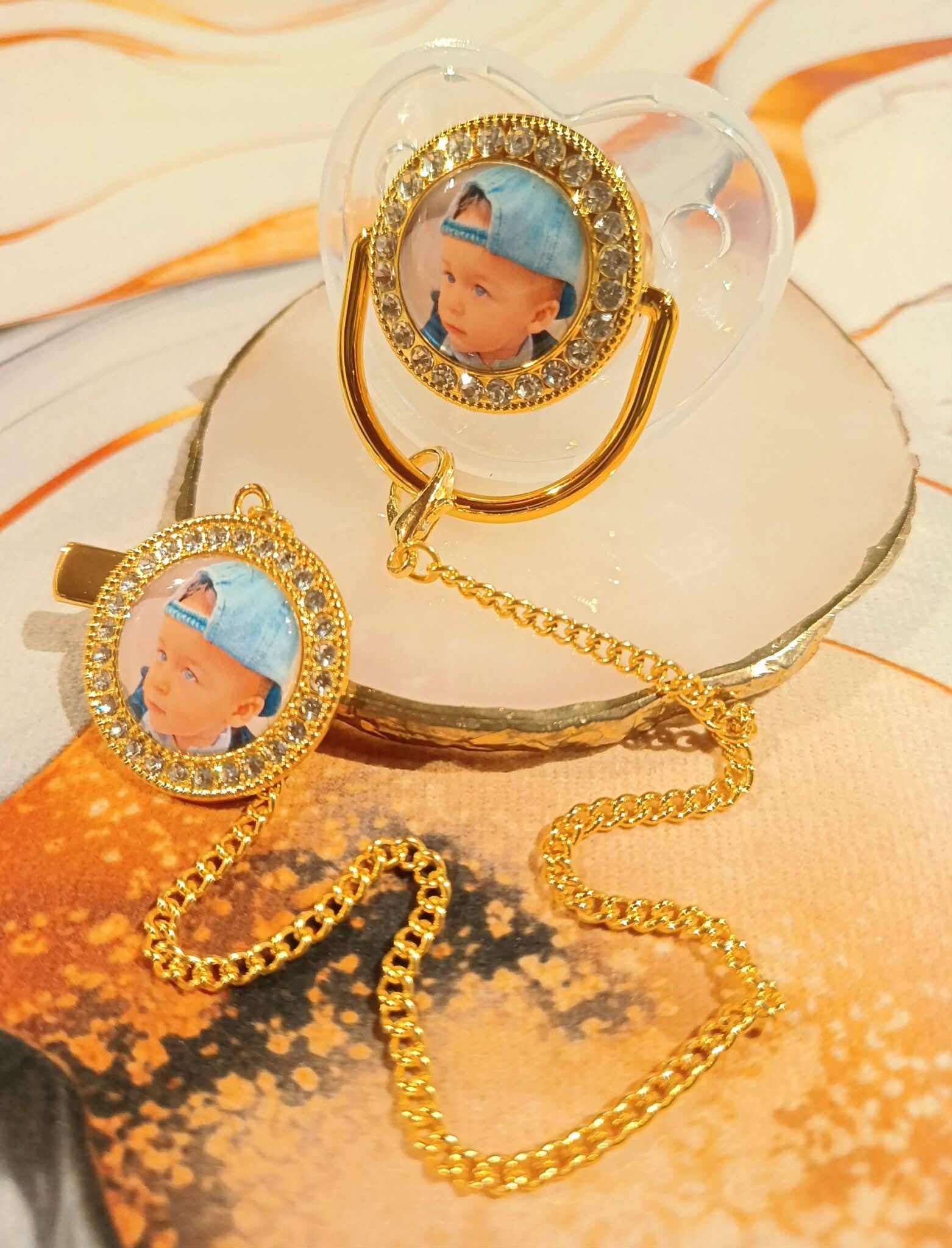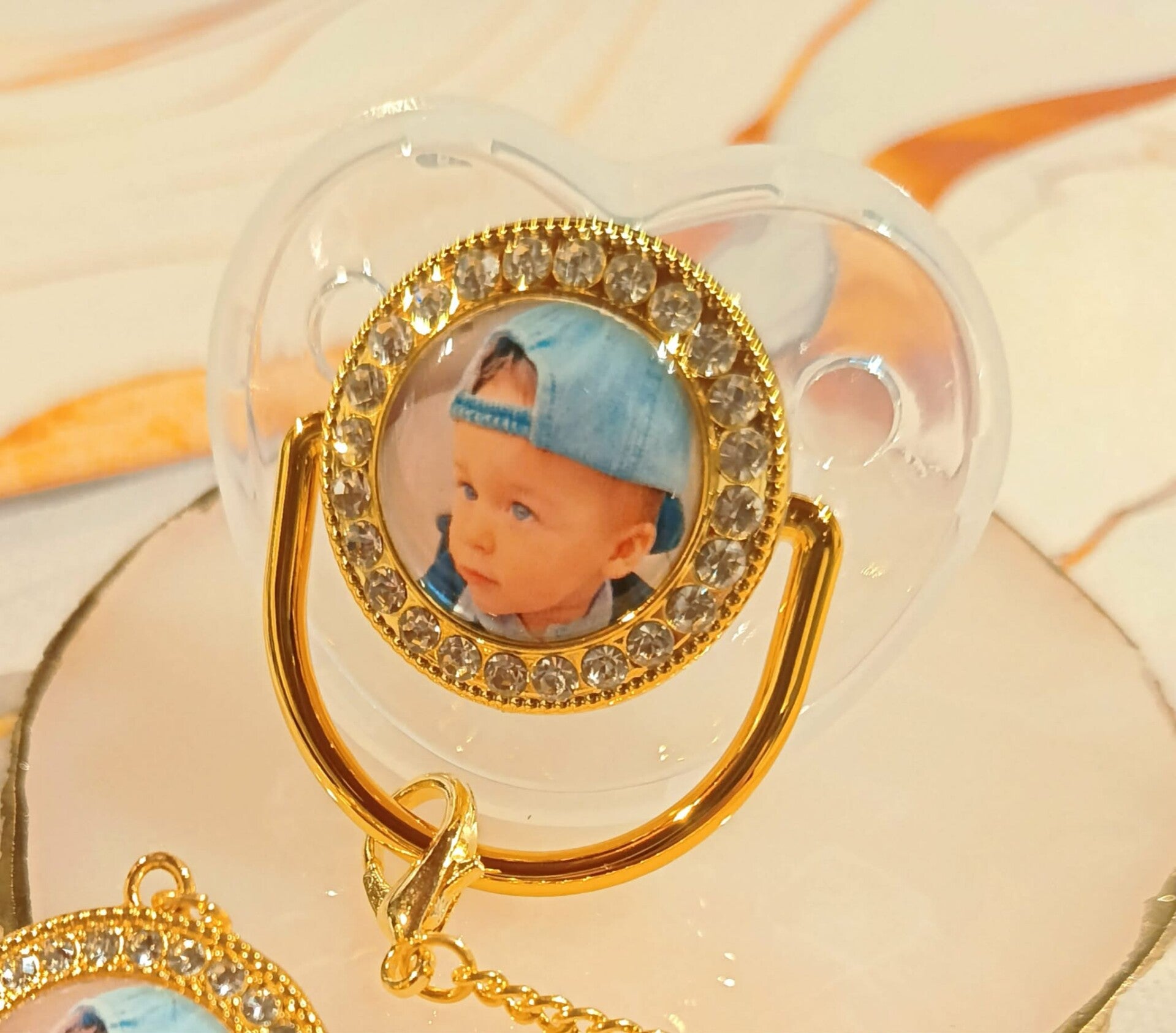 Tétine personnalisée bébé avec photo et strass + attache tétine personnalisée – 5 coloris