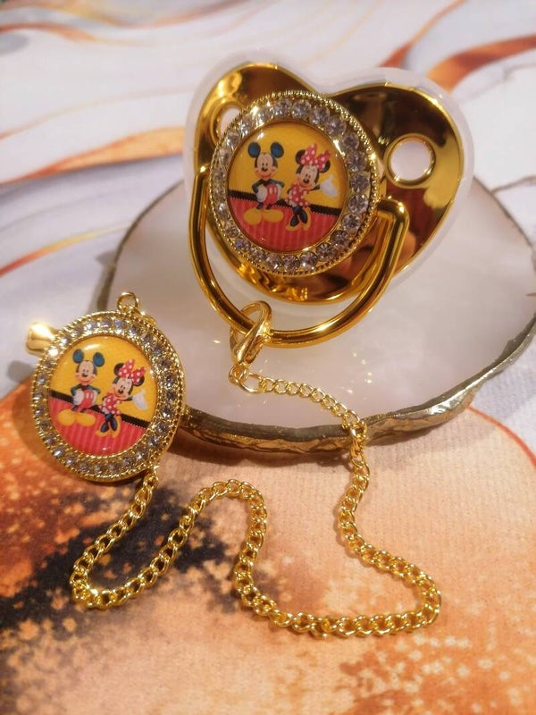 Adorable tétine décorée de strass avec attache motif Disney Mickey & Minnie, parfaite pour apporter une touche brillante et mignonne à la tenue de bébé.