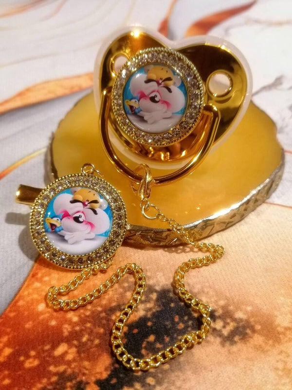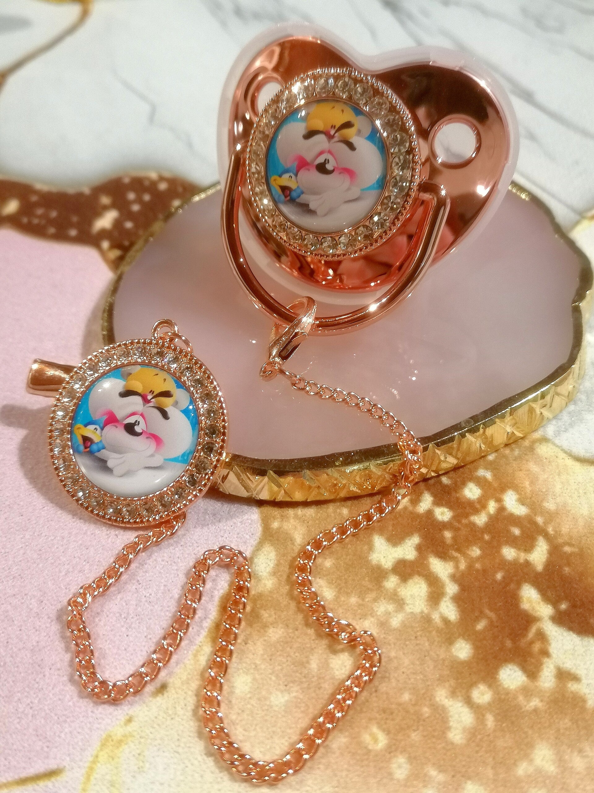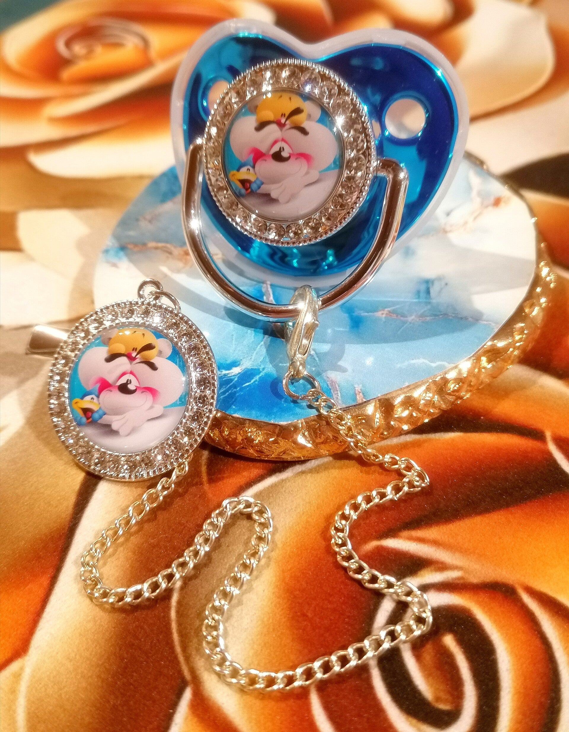 Jolie tétine décorée de strass brillants avec attache tétine motif Diddl, idéale pour apporter une touche originale et adorable aux accessoires de bébé.