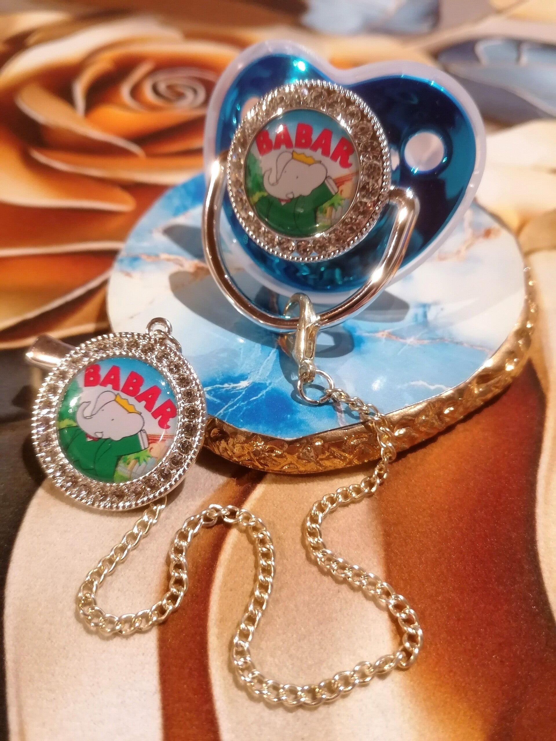 🐘 Craquez pour cette adorable tétine strass Babar avec attache signée LTDF Création, inspirée du célèbre éléphant emblématique de l’enfance !