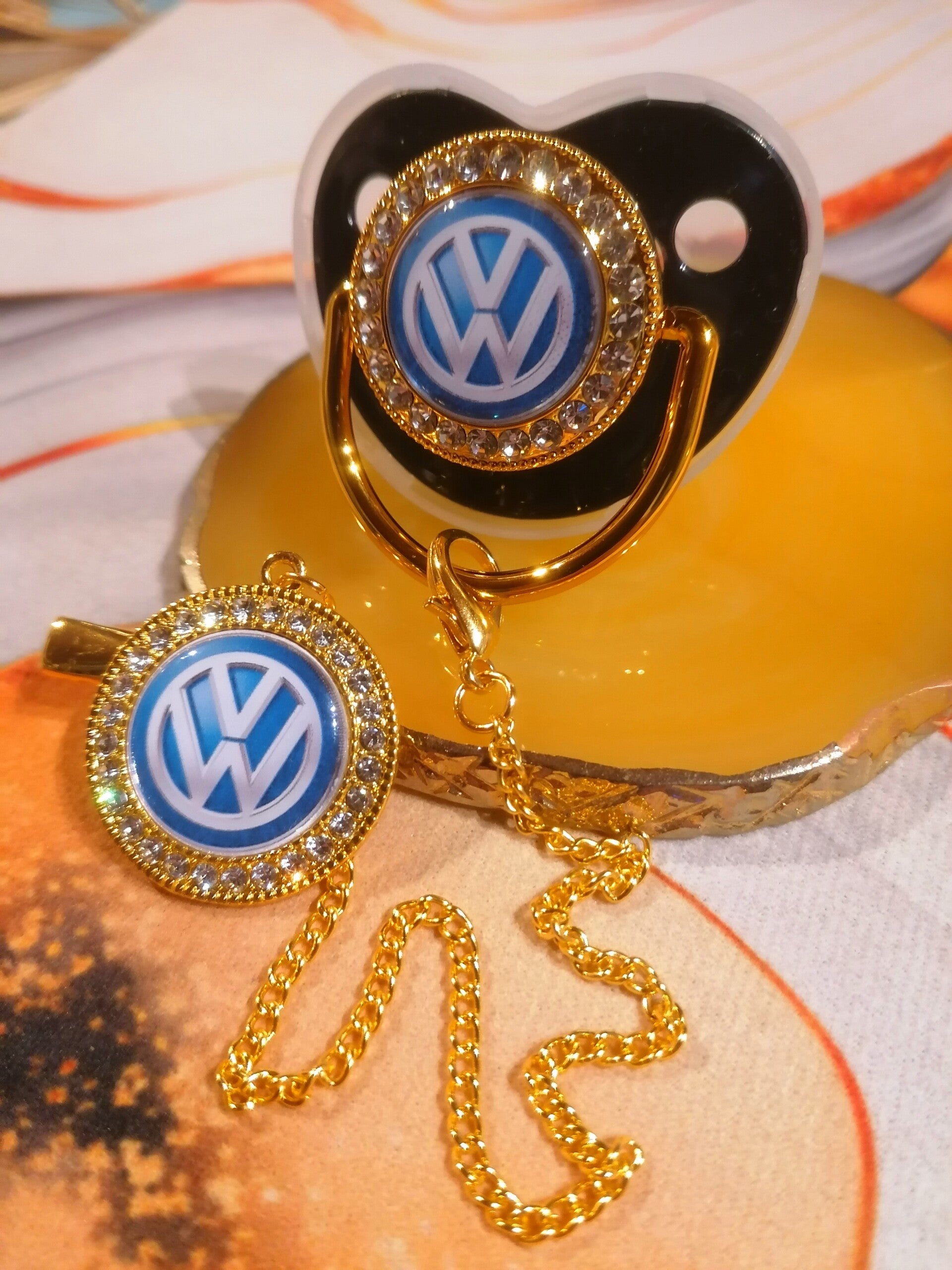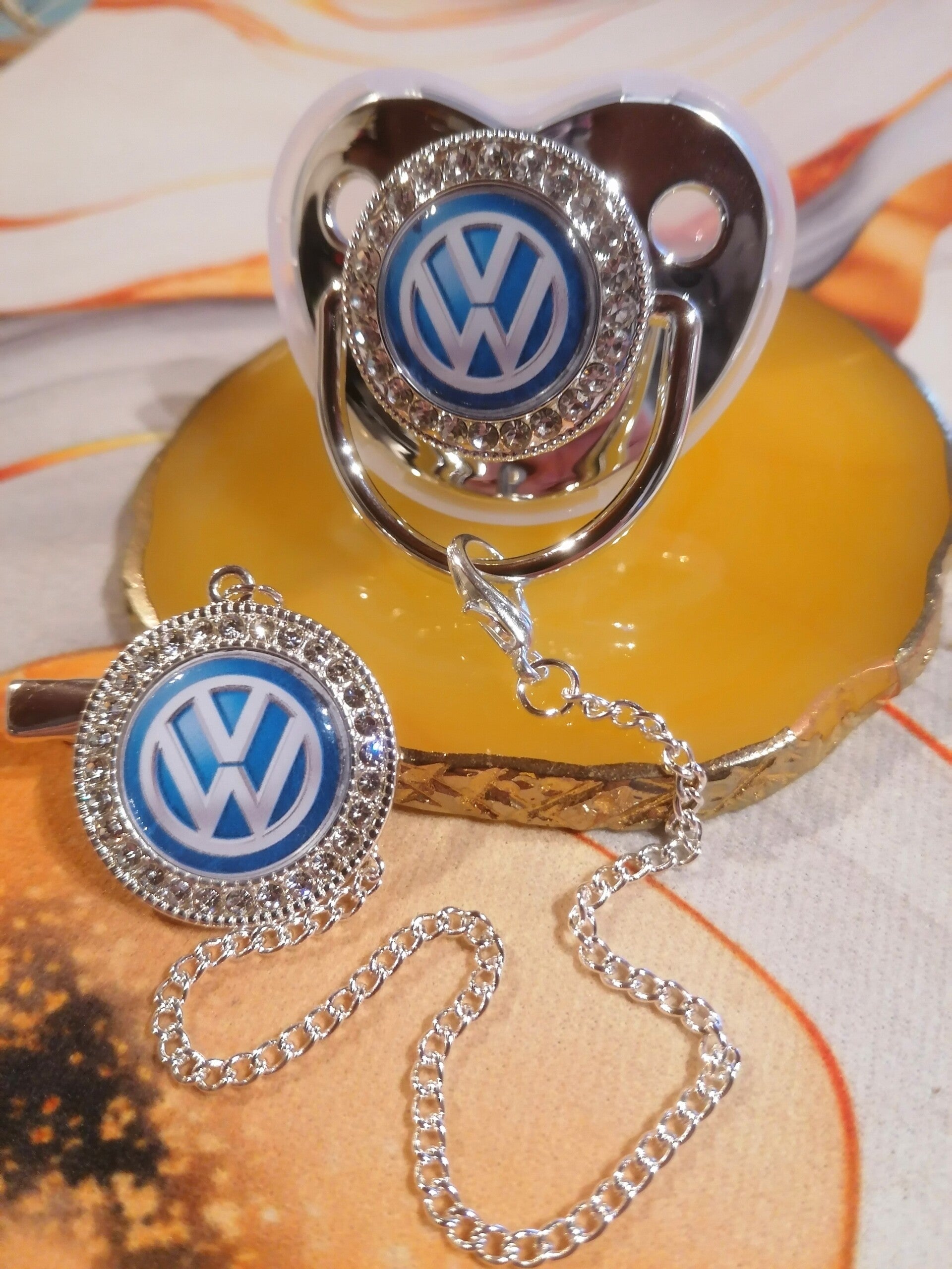 Pour les parents passionnés d’automobile, découvrez cette superbe tétine strass avec attache Volkswagen bleu. Un accessoire bébé original, élégant et pratique qui apporte une touche unique tout en assurant le confort de bébé.