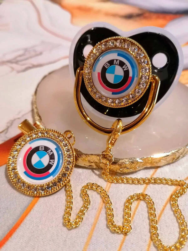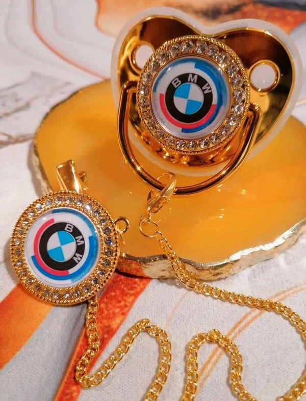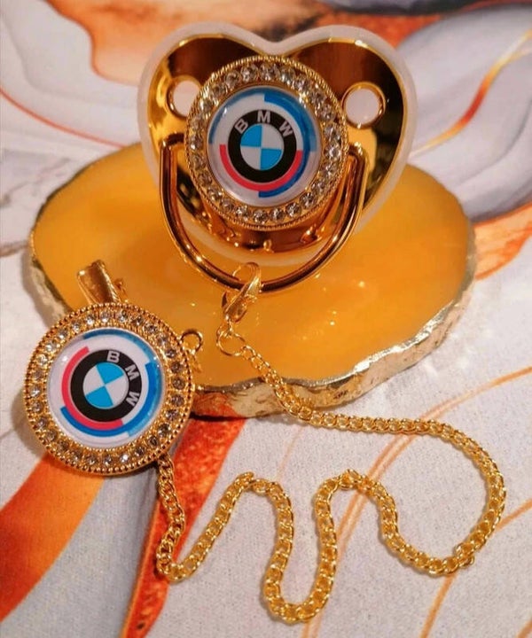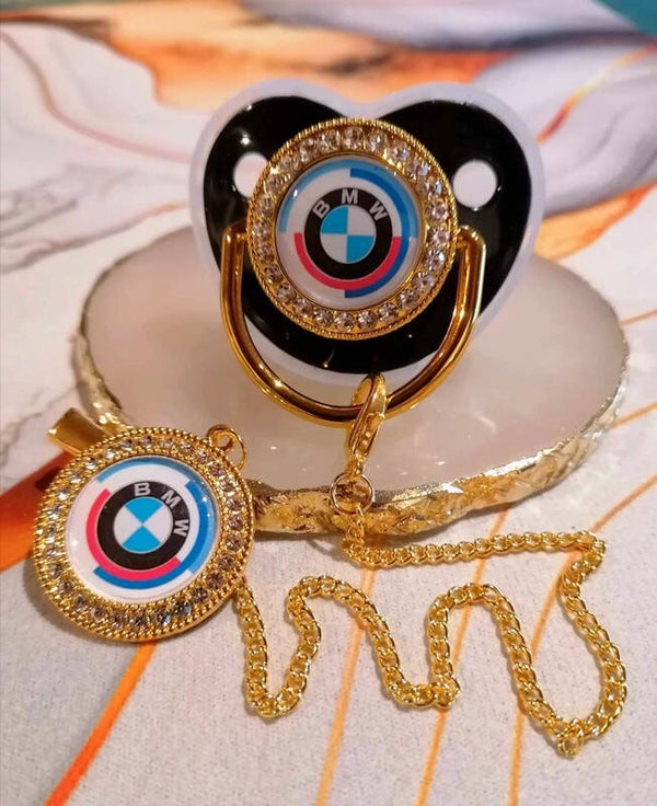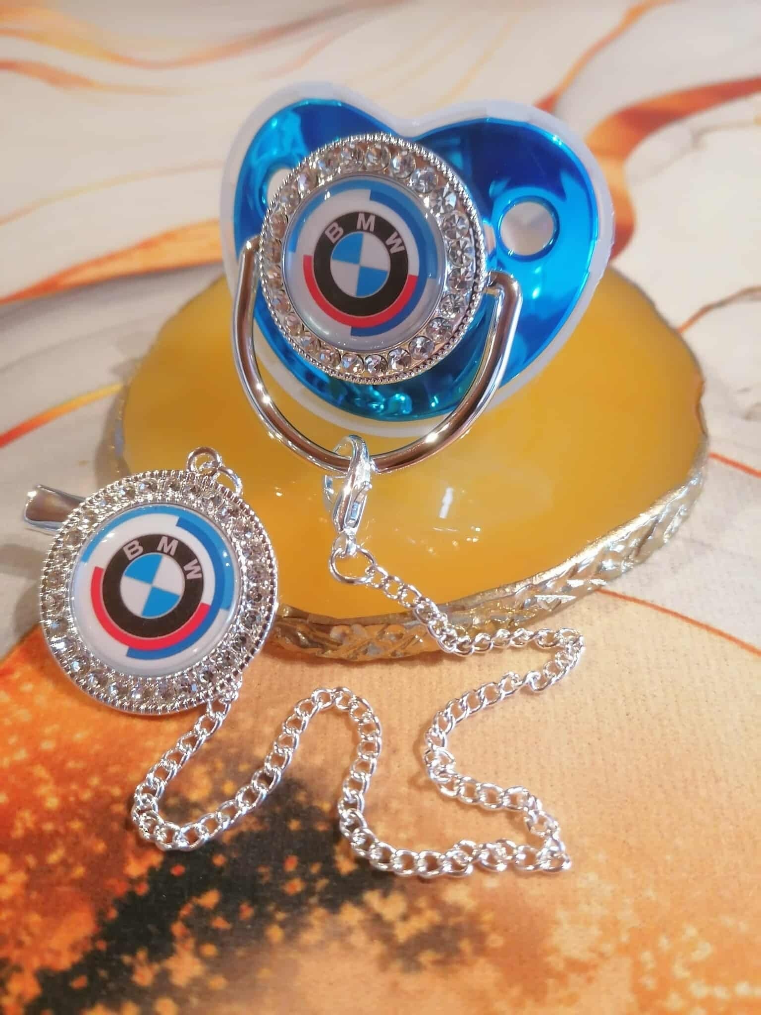 Tétine Strass avec Attache BMW 50 Ans – Forme Physiologique – 5 Coloris Disponibles 🚗✨