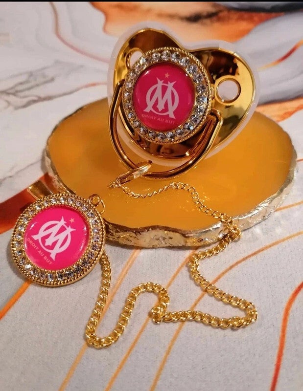 Tétine bébé strass Olympique de Marseille avec attache – Forme physiologique – 5 coloris – Clip anti-perte | LTDF Création