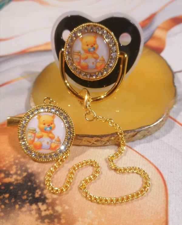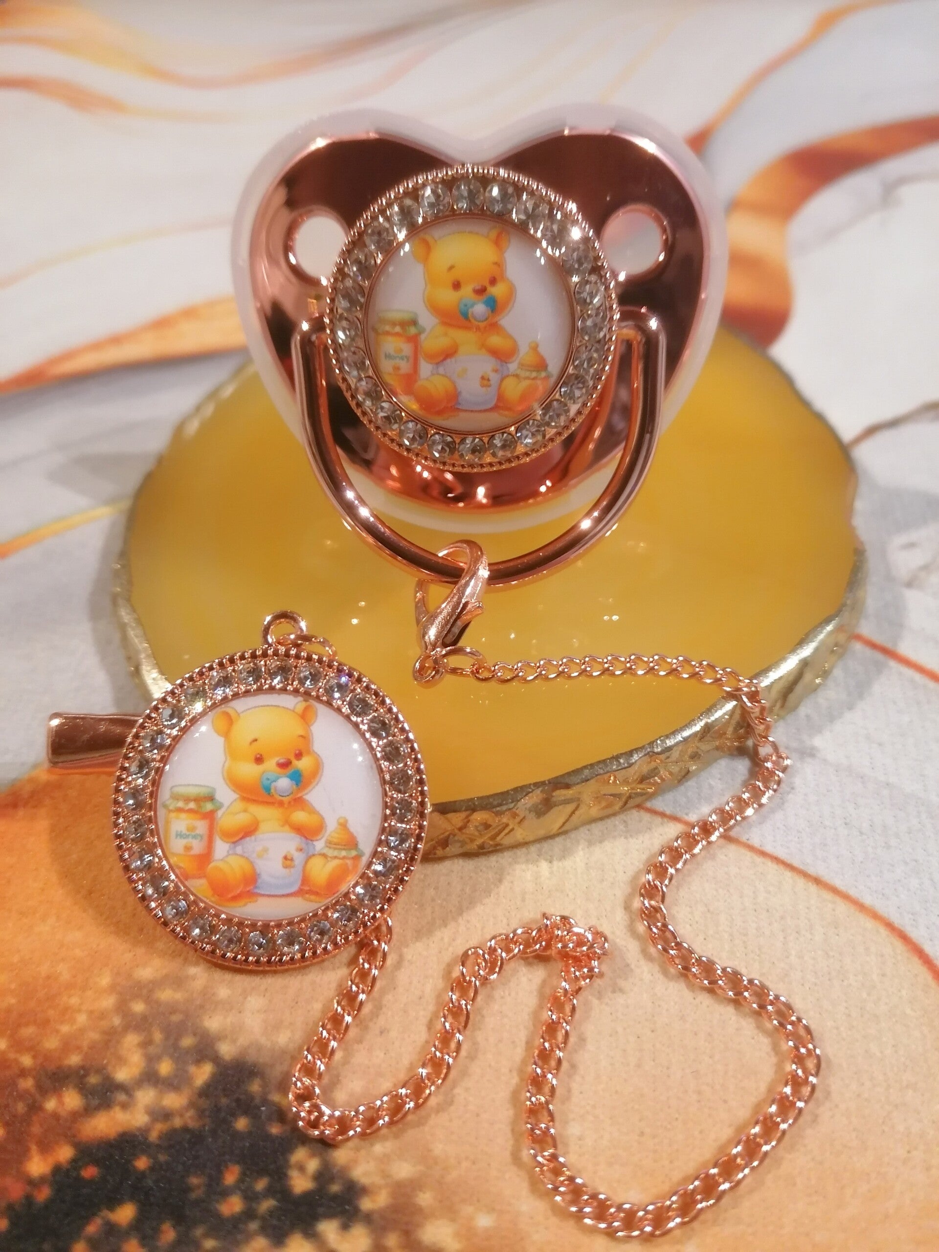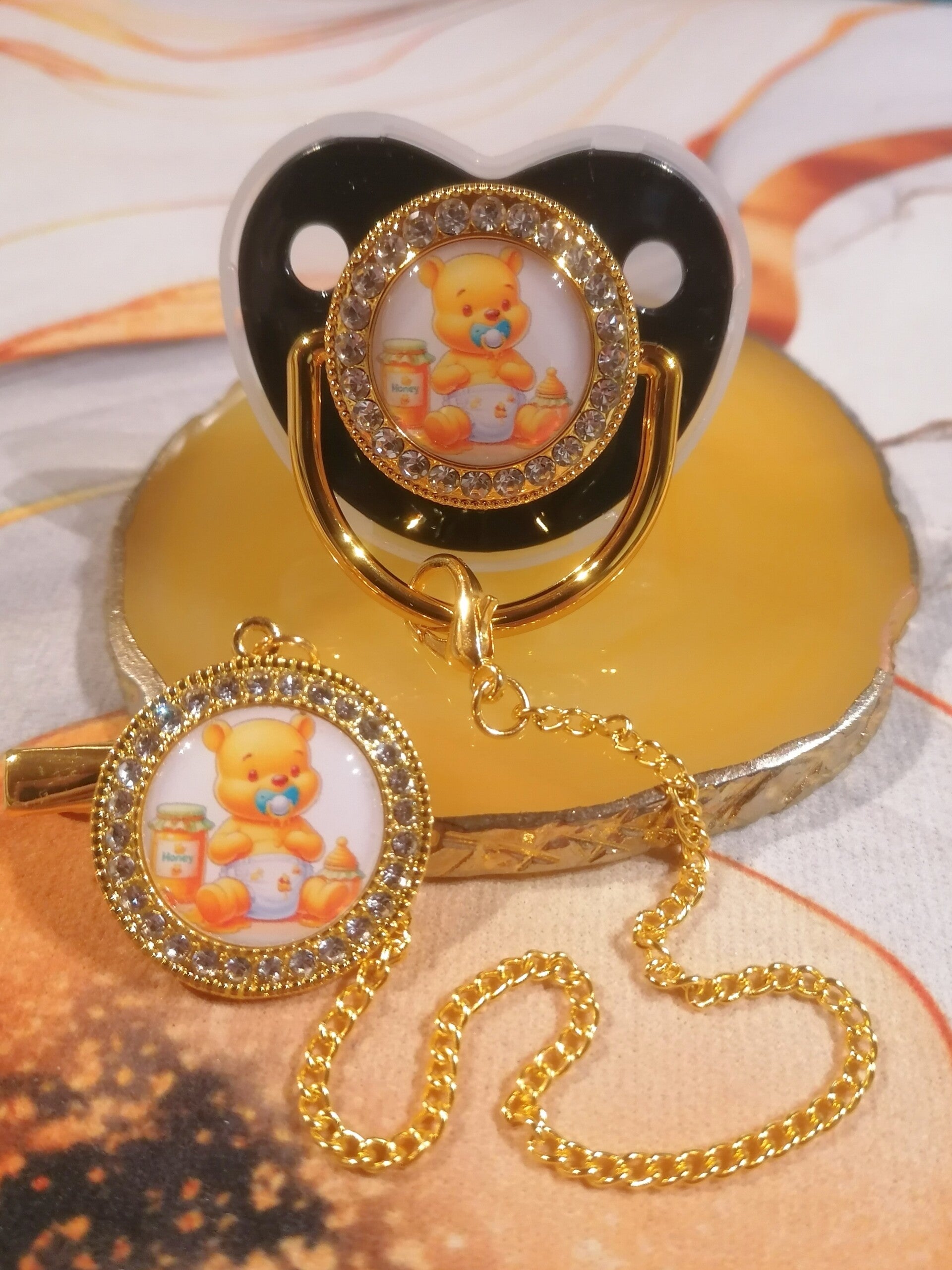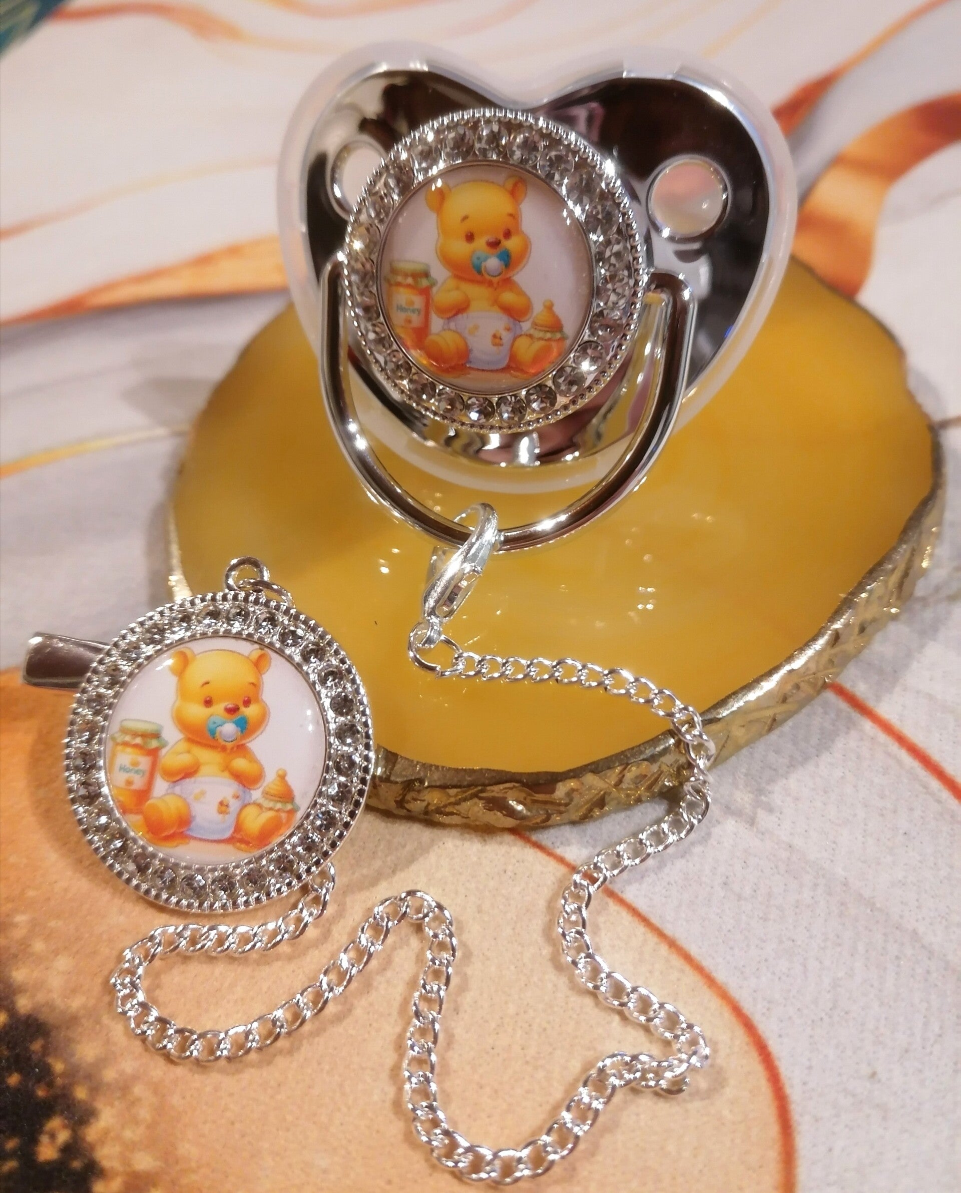 Tétine avec attache style Winnie l’Ourson – Forme physiologique bébé | 5 couleurs disponibles
