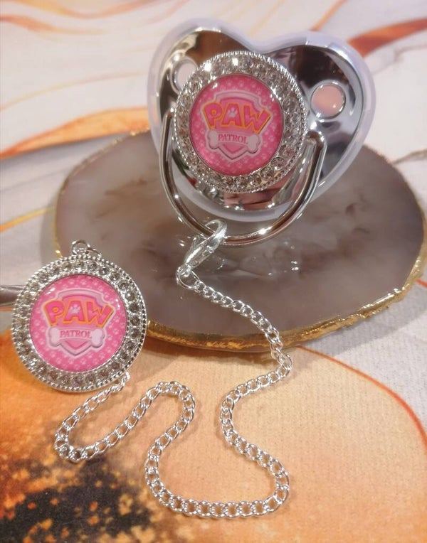 Tétine avec attache logo Pat Patrouille rose – Forme physiologique bébé fille | 5 couleurs disponibles