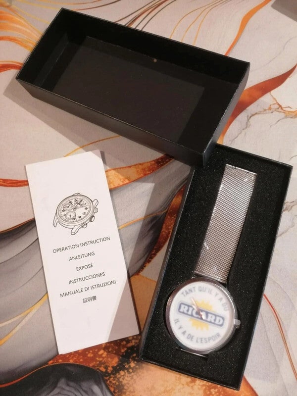Ajoutez une touche d’humour et de style à votre poignet avec cette montre originale signée LTDF Création. Son design argenté élégant en acier inoxydable s’accompagne de la célèbre phrase : « Tant qu’il y a du Ricard, il y a de l’espoir », parfaite pour les amateurs d’apéro et de bonne humeur. 🍹😄